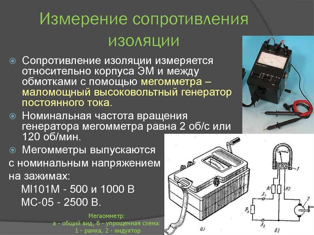 Для измерения сопротивления изоляции используется мегаомметр. Это специальный прибор, который позволяет определить сопротивление изоляции проводников. Мегаомметр подключается к испытуемому оборудованию и измеряет сопротивление изоляции между проводниками и землей.